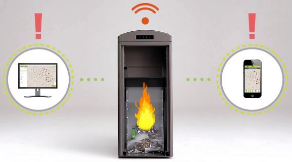 Vid brand i papperskorgen så larmas både lokalt i papperskorgen och via websidan så larm når operatören direkt.